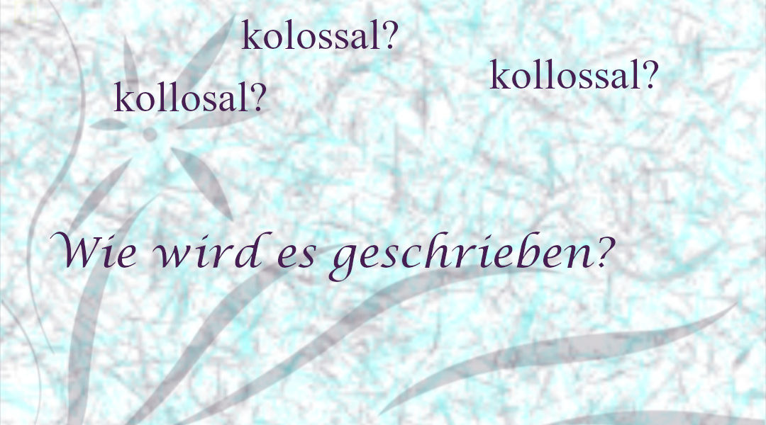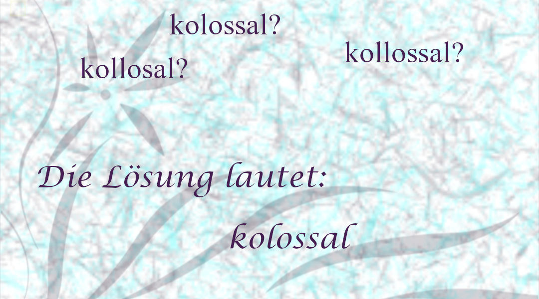 Die Lösung des gestrigen Worträtsels lautet „kolossal“. Ich benutze das Wort gelegentlich und jedes Mal muss ich nachsehen, wie es geschrieben wird. Meine bevorzugte Schreibweise, die der Duden gar nicht aufzählt, ist nämlich kollossal. Dabei musste ich gerade feststellen, dass es eigentlich eine recht gute Ableitung gibt, um die korrekte Schreibweise herauszufinden. Das Wort leitet sich natürlich vom Koloss ab. Den würde ich nie mit zwei l schreiben, und ich glaube nicht, dass diejenigen, die die andere falsche Schreibweise bevorzugen, den Koloss mit nur einem s am Ende schreiben würden. Behält man sich also den Zusammenhang im Hinterkopf, kann man das Wort letztlich nur richtig schreiben.