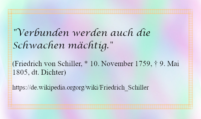 Irgendwie wirkte dieser Satz auf Anhieb bedrohlich auf mich. Ich musste an Querdenker, Rechtsradikale etc. denken, deren Moral in meinen Augen schwach ist. In ihrer Masse können sie jedoch überzeugen, weil einige darunter durchaus rhetorisch stark sind. Ihre Vielzahl und ihre rhetorischen Fähigkeiten empfinde ich als beängstigend mächtig. Zum Glück kann ich mich mit Gleichgesinnten ebenfalls zusammenschließen und aus meiner Schwäche als Einzelne eine starke Gemeinschaft bilden. Hat Schiller das so gemeint? Vermutlich war ihm diese Interpretationsmöglichkeit zu seiner Zeit noch nicht bewusst.