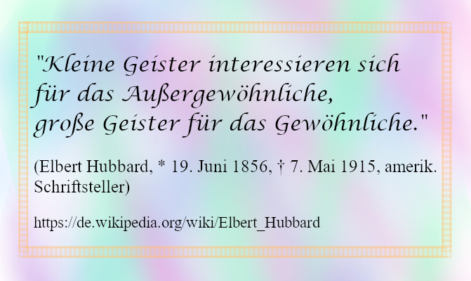 Autsch, der Spruch tut weh. Kleine Geister – das klingt so nach dumm. Na ja, dieser Elbert Hubbard hat wenigstens eine halbwegs schmeichelhafte Formulierung dafür gewählt und ich weiß nicht, ob er meine Interpretation damit meinte. Fragen kann ich ihn nicht mehr. Vielleicht meinte er auch einfach nur etwas in der Art wie z. B. fehlgeleitet. Das kann jedem mal passieren.