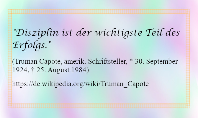 Das hier ist meine Disziplin. Ständig schreiben, sowohl für Ausschreibungen als auch für meine persönlichen Romanideen. Viel überarbeiten. Da kenne ich meine Schwachstellen und gehe darauf besonders ein, sodass ich mittlerweile auch bessere Ergebnisse erziele. Und natürlich muss ich die Geschichten einschicken. Immer wieder. Sobald ich mich auf meinen Lorbeeren ausruhe oder aufgebe, endet auch mein Erfolg. Das ist mir klar und ich werde mein Bestes geben, um einen Misserfolg aus Disziplinlosigkeit zu vermeiden.