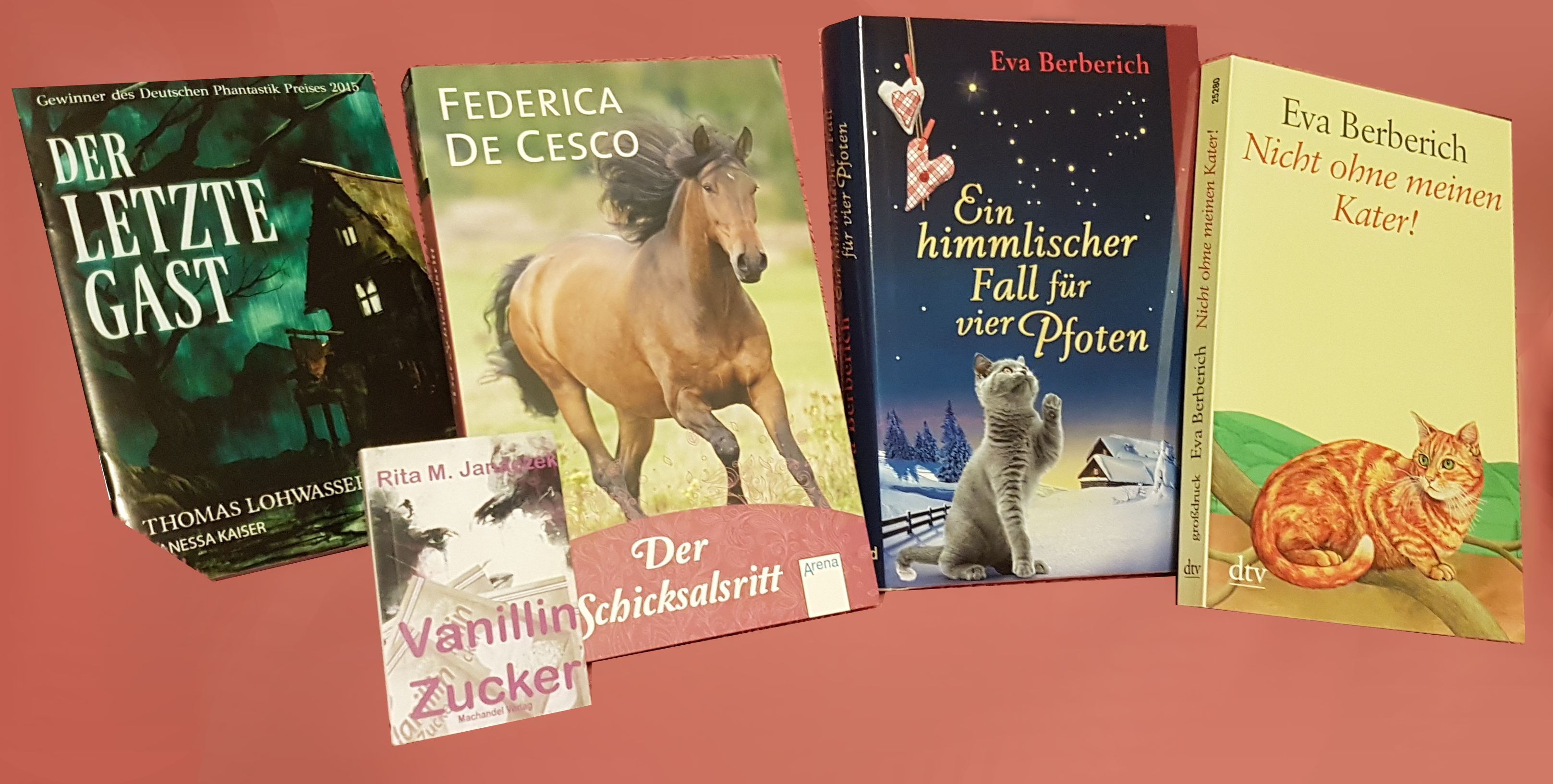 Danach las ich Nicht ohne meinen Kater! von Eva Berberich. Es ist eigentlich der Folgeband von Ein himmlischer Fall für vier Pfoten. Das habe ich nicht gemerkt, aber sie lassen sich auch in verkehrter Reihenfolge lesen. Da sie zusammengehören, bespreche ich sie auch als Einheit. Nicht ohne meinen Kater! ist eine Sammlung von Kurzgeschichten und wirken, als habe die Autorin sie selbst erlebt, wobei es interessant ist, dass sie mit ihrer Katze spricht und Antwort bekommt. Mehr davon ist mir nicht in Erinnerung geblieben. In Ein himmlischer Fall für vier Pfoten will der Kater, dass seine Besitzerin einen Krimi über den verlorenen Schwanzspitzenstern des Katersternenbildes schreibt. Die Jagd nach dem Dieb ist sehr verwirrend und nur selten wenigstens amüsant. Beide Bücher haben gemeinsam, dass der Schreibstil eigen und irgendwie ist. Schade, denn die Ideen hinter den Büchern sind gar nicht schlecht.