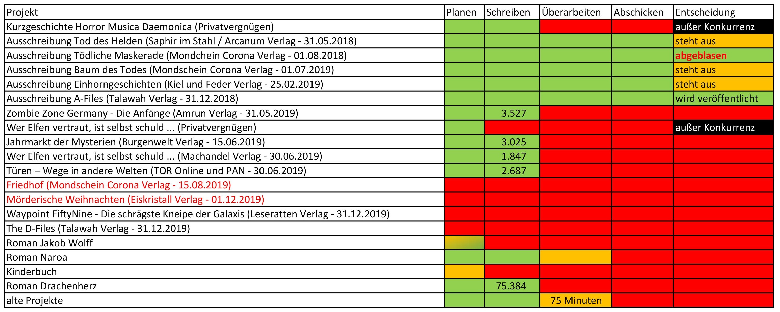 Der Punkt „Roman Jakob Wolff“ könnte dir in der Masse auch noch auffallen, da er unter Planen so seltsam grün-gelb markiert ist. Das gab es ja noch nie! Tja, das liegt daran, dass ich an einer dauerhaften Ausschreibung für eine Kurzromanreihe über den Hexenmeister Jakob Wolff teilnehmen will. Hier muss ich mich mit meinem Exposé bewerben – idealerweise BEVOR der Roman geschrieben ist. Die Ausschreibung hat mich sofort gereizt, als Marc Hamacher vom Leseratten Verlag sie hier auf Facebook geteilt hat. Das Gerüst einer möglichen Geschichte steht. Ich will nur zuvor den ersten Band lesen, um ein Gefühl für die fixen Figuren in der Reihe zu bekommen. Danach könnten sich noch Feinheiten an dem Gerüst ändern, aber wenn das dann der Herausgeberin Tanja Kummer gefällt, kann ich mit dem Schreiben losgehen. Eine ganz neue Herangehensweise für mich, die in der Verlagswelt jedoch keine Seltenheit ist. Ich war bisher nur noch nie soweit und finde es daher umso spannender, das zu erleben.