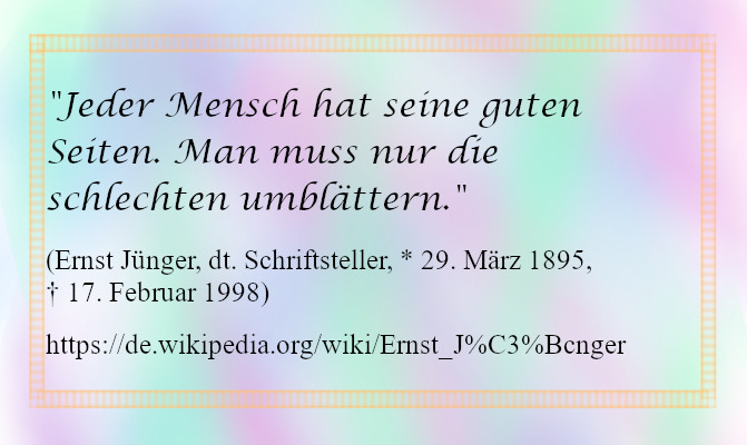 Auf welche Ideen Schriftsteller kommen können! Aber er hat recht. Es gibt keine komplett schlechten oder komplett guten Menschen. Jeder Mensch hat seine guten und schlechten Seiten. Jeder für sich definiert, welche Eigenschaft seines Gegenübers zu welcher Seite gehört. Die anderen umzuerziehen, macht keinen Sinn. Das würde dazu führen, dass jeder das versucht. Es würde in einem riesigen Chaos und Streit enden. Also bleibt uns nur, jeden so zu akzeptieren, wie er ist. Das wird leichter, wenn wir die „schlechten“ Seiten übersehen, also wie in einem Buch einfach zu einer schöneren Stelle umblättern.